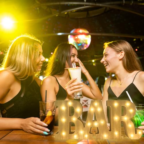 - 【BAR Letters with Lights】:The wooden LED “BAR” light up letter size is 13.2×5.7×1.2IN. The energy-saving and eye-protecting warm white light creates an elegant and surprising atmosphere for you
