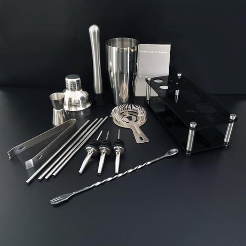 Bartender Kit, 13 Piece Cocktail Shaker Set Stainless Steel Bar Tools with Black Stand, 25 oz Shaker, Jigger, Spoon, Pourers, Muddler, Strainer, Tongs, Recipes