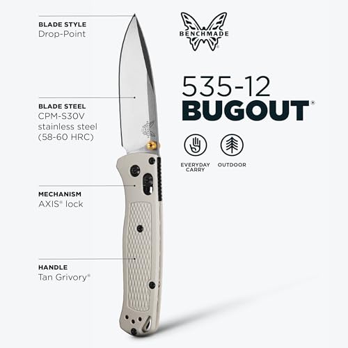 Benchmade – Bugout Outdoor EDC Folding Knife, Slim, Lightweight, Plain Edge, Drop-Point Blade, CPM-S30V Stainless Steel (58-60HRC), Grivory Handle (535-12)