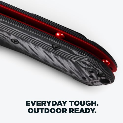 - Handle: Black and gray textured G10 with red base layer and stainless steel liners
