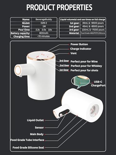- 🍾【SPECIFICATIONS】 Equipped with a built-in high capacity rechargeable battery that will last up to 9500 uses per charge. USB-C charger makes charging your BeverageBuddy faster and easier than before!
