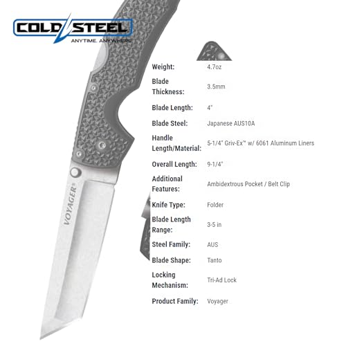 Cold Steel Voyager Large 4″ AUS10A Tanto Point Razor-Sharp Blade 5.25″ Griv-Ex Handle Everyday Carry Tactical Folding Knife w/Tri-Ad Lock