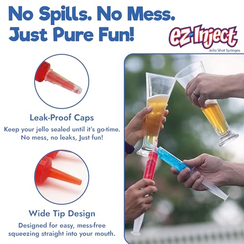 - NO LEAKS & MESSY DRIPS – EZ-inject 1oz large syringes for liquid and jello shots come with leak-free plastic caps to keep your tasty jello shot mixes intact inside the barrel and your party venue mess-free. A wide mouth tip allows you to squirt jello shot right into your mouth without creating any mess.