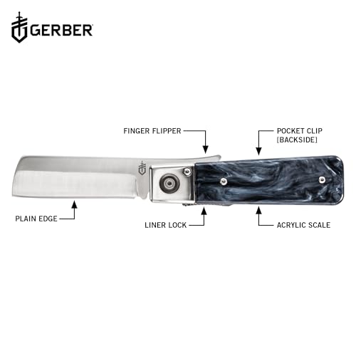 - DURABLE EDC GEAR: The Gerber Jukebox folding pocket knife features a 2.7″ satin finish fine edge blade, finger flipper, liner lock, acrylic tortoise shell scale, and pocket clip for easy carry