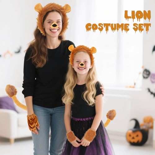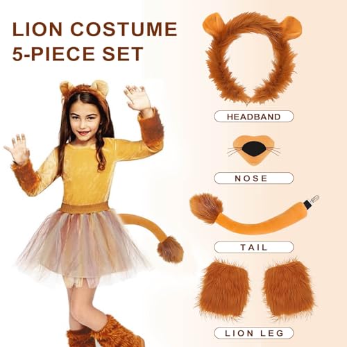 5Pcs lion costume accessories. Includes realistic Lion Headband with fluffy mane, matching leg sleeves, attachable tail, and bonus nose for a full fierce lion transformation.