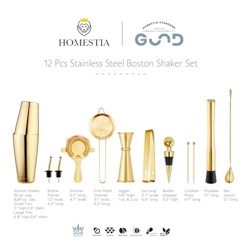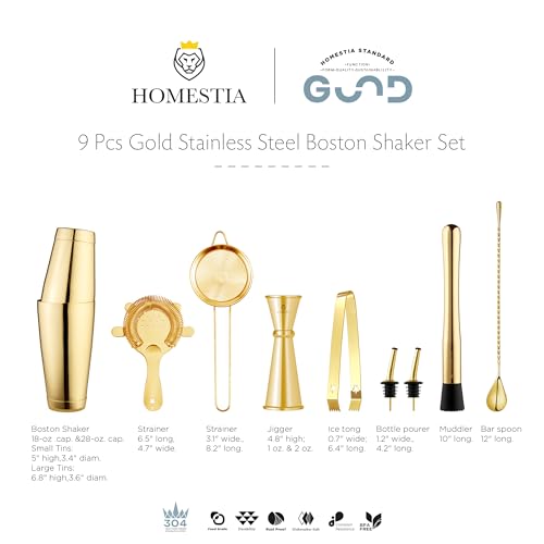 Homestia Cocktail Shaker Set, Bartending Kit: Weighted Boston Shaker Tin, Hawthorne Strainer, Jigger, Bar Spoon and Muddler, Professional Stainless Steel Bar Tool for Beginner (Gold)