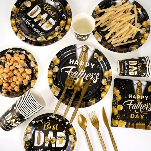 - Elevate Your Father's Day Celebration with Love and Style: This Father's Day party dinnerware set is the perfect choice for hosting your celebration, design with father’s t-shirt, suit, watch, coffee, hats, eyeglasses, gift boxes, printed with “Happy Father’s Day”, “Best Dad in the World”, infuses the theme of Father's Day, adding both convenience and style to party. Dad’s day disposable tableware set conveys respect and gratitude for fathers. These details create a warm and welcoming atmosphere at dad’s day party, enhancing the overall experience.