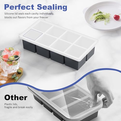 - UPGRADE LARGE SILICONE ICE CUBE TRAY: The upgrade bottom of big ice cube tray has individual compartments which make it easy to remove 1 ice cube at a time. The top lid snapped tightly and stays sealed to prevent spilling, keep ice fresh and eliminate freezer odors.