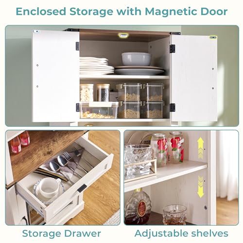 • Ample & Organized Storage: The liquor cabinet includes enclosed storage space, open shelf, and spacious drawer—featuring adjustable shelves throughout for bottles, glassware, and bar tools, all neatly organized and easy to access.