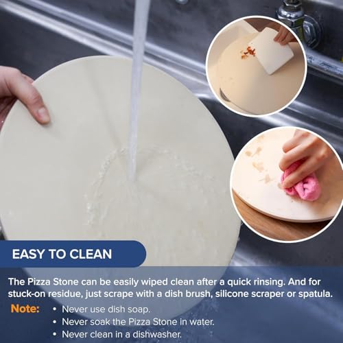 - EASY TO CLEAN – In most instances, it cleans up with a damp cloth. For more thorough cleaning, give it a good scrub with a brush. Dish soap is not recommended. Over time, it is completely normal for the pizza stone to discolor from use. It is unavoidable and doesn’t affect performance.