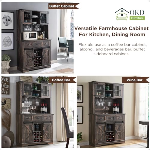 OKD 72″ Farmhosue Bar Cabinet with Sliding Barn Door, Large Kitchen Buffet with Hutch w/Wine & Glasses Rack, 3 Drawers, 12 Storage Shelves, Rustic Coffee Bar Sideboard Table, Dark Rustic Oak