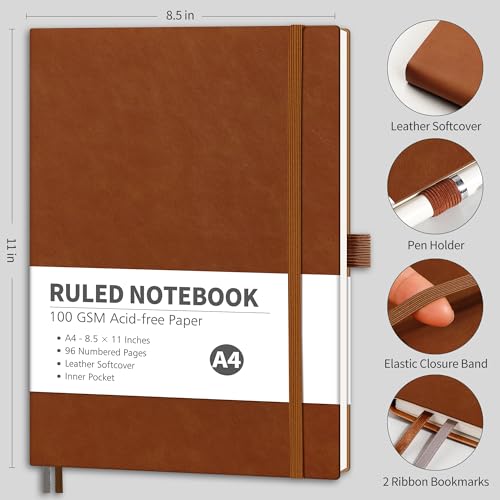 - RETTACY NOTEBOOK JOURNAL: RETTACY Notebook Journal comes in a A4 (8.5” × 11”) size, 96 Numbered Pages, waterproof and smooth Leather Softcover, 7 mm college ruled writing space, 100 GSM Thick Acid-free Paper, Elastic Closure Band, 2 Ribbon Bookmarks, Inner Pocket, Sticky Index Tabs