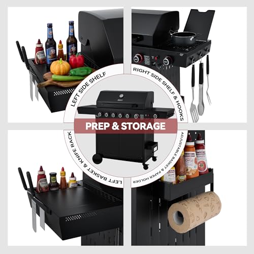 - Dual Holder & Storage Solution: The thoughtfully designed left side shelf comes with a dedicated knife holder and a built-in storage basket, keeping grilling tools and seasonings handy and mess-free while cooking.