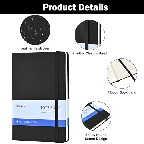 - Classic Hardcover Business Notebook: The notebook size of 5.5 X 8.2-inch, lightweight and portable. Notebook features durable and water-resistant PU leather cover, rounded corners, ribbon bookmark, elastic closure band & inner expandable pocket.