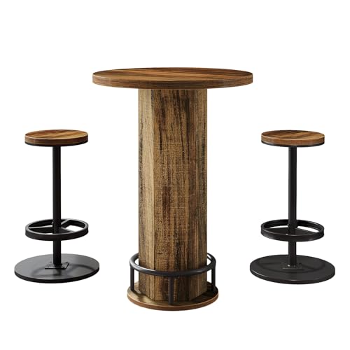 Tribesigns Round Bar Table with Chairs, Industrial Bistro Sets with 2 barstools, Pub Cocktail Table with Metal Ring Footrest for Kitchen Nook, Apartment, Small Space