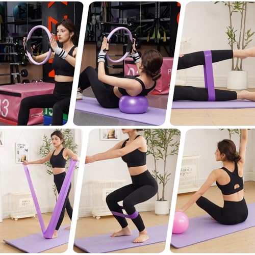 Tsikavo Pilates Ring, Pilates Ring Circle and Ball Set, 12 Inch Magic Circle Pilates Ring,9 Inch Small Exercise Ball,Resistance Bands Set, Home Pilates Equipment for Women (Pink & Purple Ring Circle)