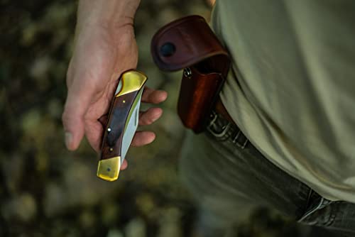 Uncle Henry LB7CP Bear Paw Traditional Lockback Pocket Knife with 3.7in Clip Point High Carbon S.S. Blade, Wood Handle, Brass Bolsters, and Leather Belt Sheath for EDC, Hunting, Camping