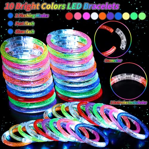 [Glow In The Dark Party Supplies Bulk] 120 PCS Glow in the Dark LED Bracelets in 10 Colors (Pink, Yellow, Crystal, Green, Sky Blue, Purple, Lemon Yellow, Orange, Rose Red), 2 flashing modes. The luminous bracelet has a large number of irregularly distributed bubbles that diffuse light through them, providing an extraordinary visual experience at…
