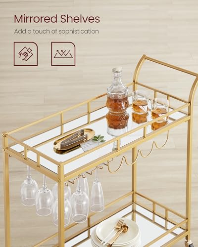 VASAGLE Bar Cart Gold, Home Bar Serving Cart, Wine Cart with 2 Mirrored Shelves, Wine Holders, Glass Holders, for Kitchen, Dining Room, Gold ULRC090A03