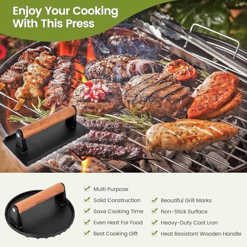 - Food-Grade Cast Iron Burger Press : Our barbeque grill press is crafted from 100% food-grade cast iron without any harmful coatings, the press can also be seasoned like cast-iron skillets to create a non-stick surface; Use the grill weight to press out unwanted grease and fat, flattening the meat and keeping its shape, keeping bacon, steaks, pork chops from curling after pressing. Our smash burger press kit are perfect for Blackstone and provide professional grilling experience at home